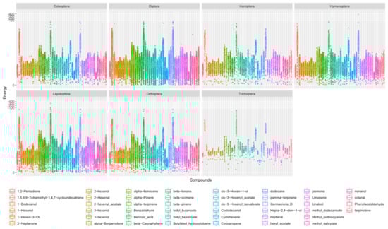 From a taxonomic point of view, the seven orders surprisingly exhibited similar energy trends of ligand docking (Figure 4), all of which had four important ligands (average binding energy lower than −6 kcal/mol), including 1,5,9,9-Tetramethyl-1,4,7-cycloundecatriene, beta-Caryophyllene, Cyclodecanol, and Germacrene D. In addition, 1,5,9,9-Tetramethyl-1,4,7-cycloundecatriene has been reported as a component of plant essential oils and is moderately toxic to storage insects [69]. Germacrene D has been reported to induce Coleoptera and Hymenoptera and is highly specific for the olfactory neurons of Noctuidae such as Helicoverpa armigera, and is also associated with Lepidoptera oviposition and other behaviors [70,71,72].