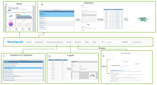 Usage instructions of iORandLigandDB: (A) home page; (B) protein basic information, protein structure, and docking information page; (C) species classification page; (D) ligand information page; and (E) autonomic prediction page.