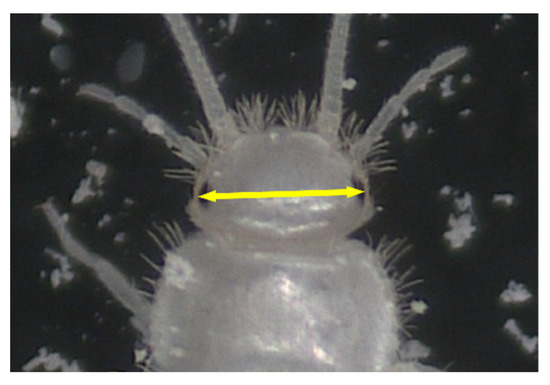 For the observation of eggs and early instar juveniles, a total of 70 eggs of known deposition dates were collected from mass-culture cages. The eggs were normally found between the layers of facial tissue or at the bottom of the cages. Using a soft writing brush, the eggs were placed in petri dishes (diameter 64 mm and depth 21 mm [including lid]) containing a sheet of facial tissue. Approximately 10 eggs were placed in one petri dish. Powdered dry crickets, soybean flour, and fecal pellets collected from mass-culture cages were added in the petri dishes as diets. Fecal pellets were included because some studies suggested that in T. domestica, a Lepismatid species, microbial symbionts are spread through feces [11,12]. When hatching or ecdysis events were observed, the individuals were photographed using a digital microscope (VMM-100, Visualix, Kobe, Japan), and the head width (HW) between their compound eyes was measured. Normally, such analysis is based on the head capsule width, but, in this study, we used the distance between the compound eyes, following a precedent study on the development of a Ctenolepisma sp. (specific name not given) [3]. Specifically, we measured the distance between the outer edges of the compound eyes of C. calvum (Figure 1). The hatching rate of eggs and survival rate of early (1st–2nd) instar juveniles were calculated. Because it was difficult to determine the survival rates of 1st and 2nd instar juveniles separately, they were grouped as the survival rate of “1st–2nd instar juveniles”, i.e., the proportion of individuals that completed the 1st and 2nd instars to all newly hatched 1st instar juveniles.