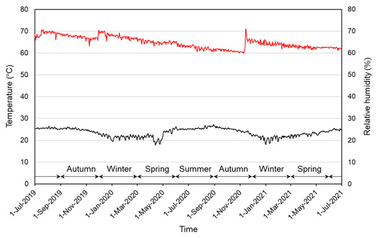 All mass-culture cages and petri dishes for the observation were kept in a larger clear polypropylene box containing a bag of moisture stabilizer (Artsorb®, Fuji Silysia Chemical Ltd., Kasugai, Japan) in a laboratory room. The temperature was unspecified and was allowed to follow that in the room. As a result, the temperature was kept mostly at 23–26 °C, but it dropped to around 20 °C in the winter season (Figure 3). The relative humidity (RH) was maintained mostly at 60–70% (Figure 3). Light conditions, similarly, were not strictly controlled, but the room was usually lit from 07:00 a.m. to 21:00 p.m., during which time the illuminance level in the polypropylene box was 40–90 lux.