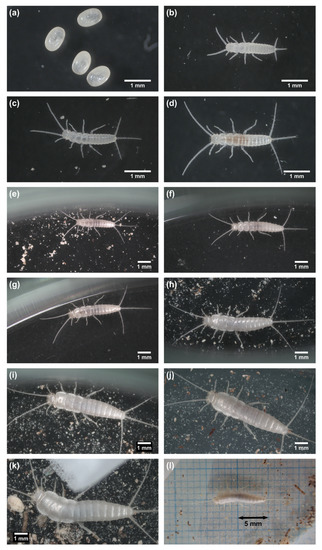 Developmental stages of C. calvum. (a) eggs; (b) 1st instar; (c) 2nd instar; (d) 3rd instar; (e) 4th instar; (f) 5th instar; (g) 6th instar; (h) 7th instar; (i) 8th instar; (j) 10th instar; (k) 13th instar; (l) entire body and appendages of the same individual as in (k). Note that the images in (a–k) are not necessarily of the same individual.