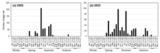 Seasonal trend in oviposition in a year. (a) Eggs collected in 2020 from mass-culture cages and petri dishes for individual rearing; (b) Eggs collected in 2022 from two cages containing a total of 17 females.