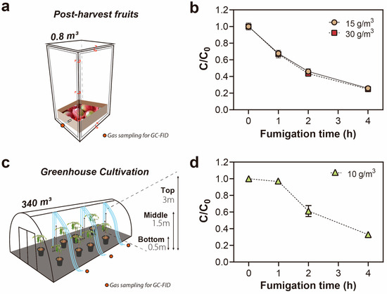 Gas concentration in the greenhouse was measured using a portable gas analyzer (RAE Systems Minirae 3000, JJS Technical Services, Schaumburg, IL, USA) to assess worker safety during ventilation at different time intervals after the end of fumigation experiments.