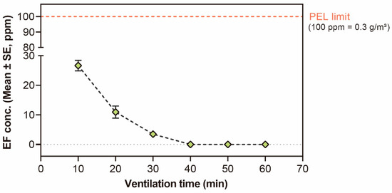 In the assessment of worker safety, EF concentration during the greenhouse ventilation process showed a rapid decrease to less than 100 ppm (EF at 100 ppm is the acceptable exposure level in Korea) within 10 min, but more than 1 h was still needed to lower its potential hazardous conditions, which could cause unexpected acute inhalation risk in the greenhouse (Figure 3).