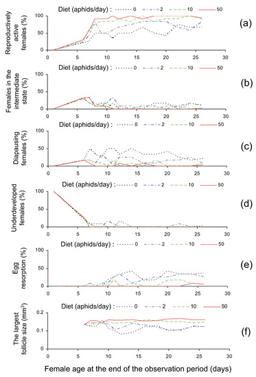 Reproductive state of Cheilomenes propinqua females at dissection in relation to diet (the number of aphids offered daily) and age (days from emergence): (a)—the percentage of reproductively active females (females with fully developed ovaries: follicles are vitellinized; mature oocytes are present; the largest oocyte reached the maximum size), (b)—the percentage of females in the intermediate state (females with moderately developed ovaries: follicles are of medium size and become vitellinized; ovarioles are markedly swollen; the largest oocyte is filled with whitish yolk), (c)—the percentage of diapausing females (ovaries are not or poorly developed; fat body is moderately or fully developed), (d)—the percentage of underdeveloped females (both ovaries and fat body are not or poorly developed), (e)—the percentage of females with egg resorption (resorptive oocytes are smaller, their shape and structure are modified, they are darker than normal oocytes; resorption was also recorded for all females which laid eggs but have not fully developed ovaries upon dissection), (f)—the size (volume) of the largest follicle (mm3). See Section 2.2 and Figure 1 for more explanations. Some lines are slightly shifted to avoid overlap.