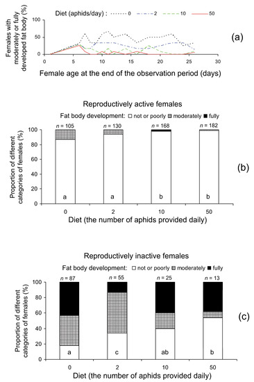 Fat body development in Cheilomenes propinqua females: (a)—the percentage of females with moderately or fully developed fat bodies at dissection in relation to diet (the number of aphids offered daily) and age (days from emergence), (b)—fat body development in reproductively active females in relation to diet, (c)—fat body development in reproductively inactive females in relation to diet. In (b,c): the percentage of females is shown; above the bars, sample size n is indicated. Different letters inside the bars indicate a significant difference (p < 0.05 by the chi-square test) between corresponding treatments. Some lines in (a) are slightly shifted to avoid overlap.