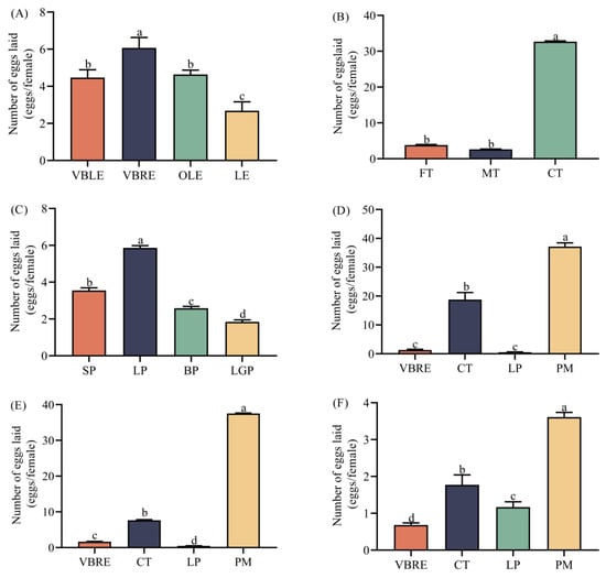 Numbers of eggs laid by the gravid Z. tau females with different Solanaceae crops. Different lowercase letters mean significant differences among different cultivars or species at the same time point, at p < 0.05. (A) Numbers of eggs laid by the gravid Z. tau females for different eggplant cultivars. (B) Numbers of eggs laid by the gravid Z. tau females for different tomato cultivars. (C) Numbers of eggs laid by the gravid Z. tau females for different pepper cultivars. (D) Numbers of eggs laid by the gravid Z. tau females for the complete fruit of different Solanaceae species. (E) Numbers of eggs laid by the gravid Z. tau females for the peel fragments of different Solanaceae species. (F) Numbers of eggs laid by the gravid Z. tau females for the fruit odors of different Solanaceae species. FT: Fleshy tomato; MT: Mushy tomato; CT: Cherry tomato; VBLE: Violet-black long eggplant; VBRE: Violet-black round eggplant; OLE: Ordinary long eggplant; LE: Linear eggplant; SP: Screw pepper; LP: Linear pepper; BP: Bell pepper; LGP: Long green pepper; PM: Pepino melon.