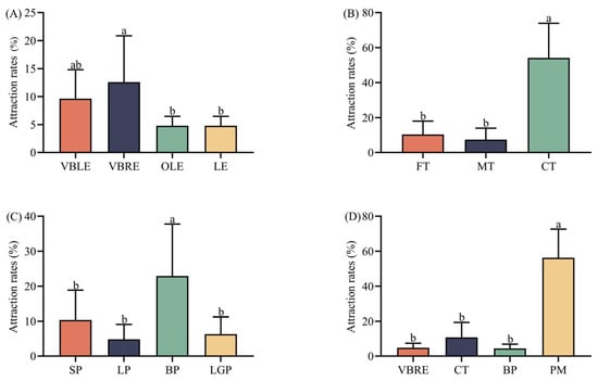 Attraction rates for the gravid Z. tau females for different Solanaceae crops. Different lowercase letters mean significant differences among different cultivars or species at the same time point, at p < 0.05. (A) Attraction rates for the gravid Z. tau females for different eggplant cultivars. (B) Attraction rates for the gravid Z. tau females for different tomato cultivars. (C) Attraction rates for the gravid Z. tau females for different pepper cultivars. (D) Attraction rates for the gravid Z. tau females for the fruit odors of different Solanaceae species. FT: Fleshy tomato; MT: Mushy tomato; CT: Cherry tomato; VBLE: Violet-black long eggplant; VBRE: Violet-black round eggplant; OLE: Ordinary long eggplant; LE: Linear eggplant; SP: Screw pepper; LP: Linear pepper; BP: Bell pepper; LGP: Long green pepper; PM: Pepino melon.