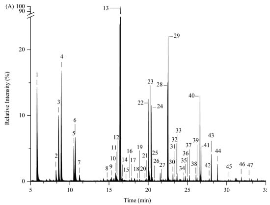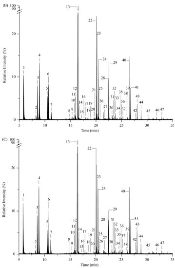 Peak chromatographic plot of the relative intensity of volatile compounds in S. muricatum. (A) The first biological replicates. (B) The second biological replicates. (C) The third biological replicates. The numbers from 1 to 47 on the peaks correspond to the numbers of the compounds in Table 2.