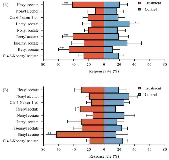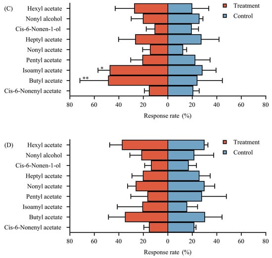 Olfactory behavioral responses of gravid Z. tau females to nine compounds from the S. muricatum volatile headspace. The dark orange bars show the percentages of the treatment group, blue bars show the percentages of the control group, asterisks (*) show that the percentages were significant at the p < 0.05 level, and binary asterisks (**) show that the percentages were significant at the p < 0.01 level. The total response rates were more than 65% for those marked with asterisks (*) and binary asterisks (**). (A) The response rate at a concentration of 5 mg/mL. (B) The response rate at a concentration of 0.5 mg/mL. (C) The response rate at a concentration of 0.05 mg/mL. (D) The response rate at a concentration of 0.005 mg/mL.