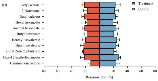 Olfactory behavioral responses of gravid Z. tau females to 11 compounds from the S. muricatum volatile headspace. The dark orange bars show the percentages for the treatment group, blue bars show the percentages for the control group, asterisks (*) show that the percentages were significant at the p < 0.05 level, and binary asterisks (**) show that the percentages were significant at the p < 0.01 level. The total response rates were more than 65% for those marked with asterisks (*) and binary asterisks (**). (A) The response rate at a concentration of 5 mg/mL. (B) The response rate at a concentration of 0.5 mg/mL. (C) The response rate at a concentration of 0.05 mg/mL. (D) The response rate at a concentration of 0.005 mg/mL.