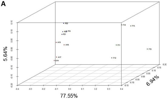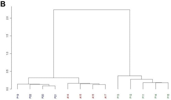 Multivariate analysis of the chromosomal inversion composition of the Petnica, Avala, and Font Groga populations of D. subobscura. (A) Principal coordinate analysis. Two groups are clearly differentiated on the left, corresponding to the Petnica and Avala collections. On the right is the group of samples from Font Groga. (B) GEVA-Ward cluster study. The first partition differentiates the Font Groga collections from those of the Serbian populations (Petnica and Avala). The second partition generates two groups, one with the Petnica samples and the other with those from Avala. The abbreviations used are: in blue, P19 (Petnica 2019), P20 (Petnica 2020), P21 (Petnica 2021), and P22 (Petnica 2022); in red, A14 (Avala 2014), A15 (Avala 2015), A16 (Avala 2016), and A17 (Avala 2017); in dark green, F11 (Font Groga 2011), F12 (Font Groga 2012), F13 (Font Groga 2013), F14 (Font Groga 2014), and F15 (Font Groga 2015).