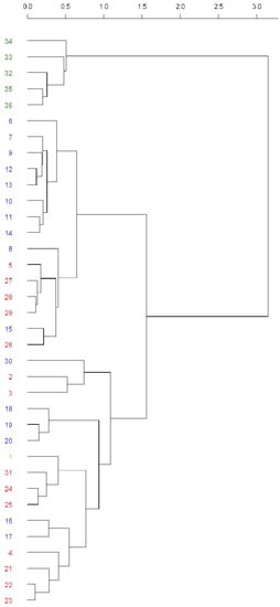 Its cophenetic correlation was 0.78, showing good accuracy of the tree. The first partition clearly separated the Font Groga samples from all others (from the top down in the tree, population numbers 34–36). The second partition differentiated two groups, the first mainly constituting the most recent samples from the Balkans (from the top down in the tree, population numbers 6–26), whereas the second constituted the remaining populations. Interestingly, in the group composed of population numbers 6–26, a pair of subgroups can be observed. The first one (population numbers 6–14) was composed of the samples from Avala (Cfb climate) and the second (population numbers 8–26) mainly of the populations present in the Cfa climate. The large group of remaining populations (from the top down in the tree, population numbers 30–23) was a mixture of samples from different locations, months, and climates (Cfa and Cfb), with Mt. Parnes (Greece) inside this group (number 1, Csb climate). Studying this group in particular, it can be observed that, generally, the last partitions correspond to the samples from the same population or from the same climate. In the PCoA analysis (Figure S1), first, second, and third axes explained 37.84%, 16.94%, and 9.93%, respectively. It showed similar results as those obtained from the cluster analysis, but more difficult to observe.