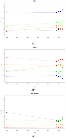 For all chromosomes (A, J, U, E, and O), the comparisons between the inversion chromosomal polymorphism for 1995 and those from 2019, 2020, 2021, and 2022 are presented in Table S3. For the comparison between the 1995 and 2019 samples, all chromosomes presented significant differences with the exception of A and O. For the second one (1995 and 2020), significant differences were reported for the U, E, and O chromosomes, although the significance was lost when FDR correction was applied for the O chromosome (adjusted p = 0.0560). In the case of the comparison between 1995 and 2021, only the U and O chromosomes presented significant differences, but the latter was lost with the FDR correction (adjusted p = 0.0560). Finally, when comparing the 1995 and 2022 inversion compositions, the U, E, and O chromosomes presented significant differences. However, considering the years 1995, 2019, 2020, 2021, and 2022, it is interesting to observe the changes over time in the ‘cold’—(Figure 4a), ‘warm’—(Figure 4b), and ‘non-thermal’—(Figure 4c) adapted inversions for the Petnica population.
