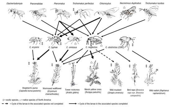 Host plant associations of Ceutorhynchus and their parasitoids. ‡ = exotic species, ⌂ = native species of North America. The thicker lines for relationships that have been seen more times.