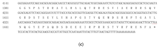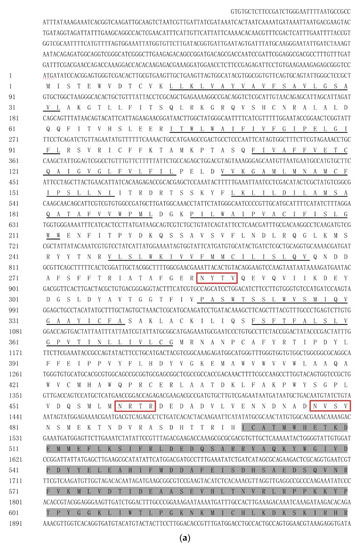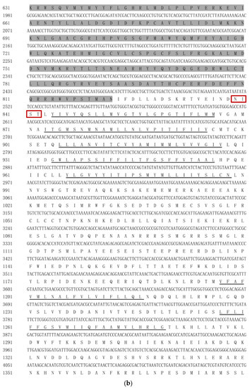 (a) The amino acid sequence of HvChsb from H. vitessoides. (b) The amino acid sequence of HvChsb from H. vitessoides. (c) The amino acid sequence of HvChsb from H. vitessoides. The start codon and the termination codon are marked with a red dotted line, conserved regions are marked with gray shading, the 16 transmembrane domains are marked with black underlines, and the 4 potential N-glycosylation sites are surrounded by red boxes.