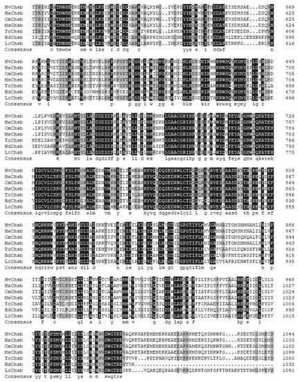 Sequence alignment of HvChsb with insect homologs. The amino acid residues that are identical in all sequences are marked with dark shading, whereas light shading indicates that at least 75% amino acids are identical in all sequences. The aligned sequences are the predicted amino acid sequences of Chsbs from H. vitessoides (HvChsb GenBank accession number ON783456), Helicoverpa armigera (HaChsb AKZ08595.1), Cnaphalocrocis medinalis (CmChsb AJG44539.1), Mythimna separata (MsChsb ASF79498.1), Tribolium castaneum (TcChsb AAQ55061.1), Bactrocera dorsalis (BdChsb KC354694.1), and Locusta migratoria (LmChsb JQ901491.1).