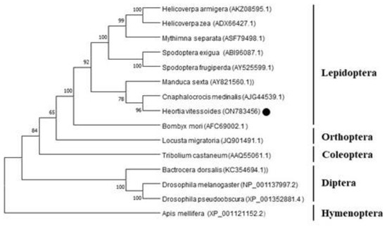 To understand the relationships between the Chsb genes and different insects, the Chsb genes of insects in Lepidoptera, Diptera, Orthoptera, Coleoptera, and Hymenoptera were selected to construct a phylogenetic tree. The results showed that the relationship between Cnaphalocrocis medinalis and H. vitessoides was the closest in Lepidoptera, having a confidence level of 96% (Figure 3).