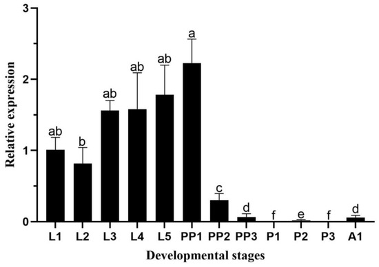 Relative expression levels of HvChsb at different stages: L1–L5, first- to fifth-instar larvae; PP1–PP3, 1- to-4-day-old pre-pupae; P1–P3, 1-to-3-day-old pupae; A1, 1-day-old adults. Error bars represent mean ± standard error of three biological replicates. Different letters above error bars indicate significant differences (p < 0.05) based on one-way ANOVA and Tukey’s test.