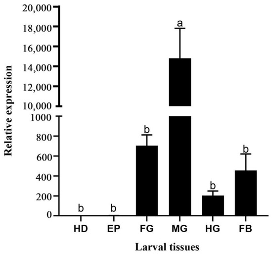 Relative expression levels of HvChsb in different larval tissues (tissue anatomy for the fifth-instar larvae). Relative expression in larval tissues: HD, head; EP, epidermis; FG, foregut; MG, midgut; HG, hindgut; and FB, fat body. Error bars represent mean ± standard error of three biological replicates. Different letters above error bars indicate significant differences (p < 0.05), which were based on one-way analysis of variance (ANOVA) and Tukey’s test.