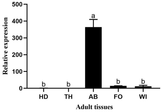 Relative expression in adult tissues: HD, head; TH, thorax; AB, abdomen; FO, foot; and WI, wing. Error bars represent mean ± standard error of three biological replicates. Different letters above error bars indicate significant differences (p < 0.05), which were based on one-way analysis of variance (ANOVA) and Tukey’s test.