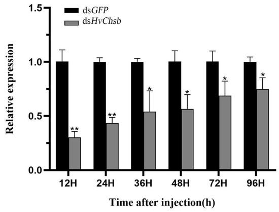 Changes in mRNA level after treatment with specific RNA interference. Relative transcript levels of HvChsb in L3D1 larvae after injection with dsHvChsb at a concentration of 3.0 µg/µL for 12, 24, 36, 48, 72, and 96 h. The sample size was 120 larvae, which were divided into three biological replicates. Error bars represent mean ± standard error of three biological replicates. * p < 0.05, ** p < 0.01. Analysis was performed via one-way analysis of variance (ANOVA), followed by Student’s t-test.