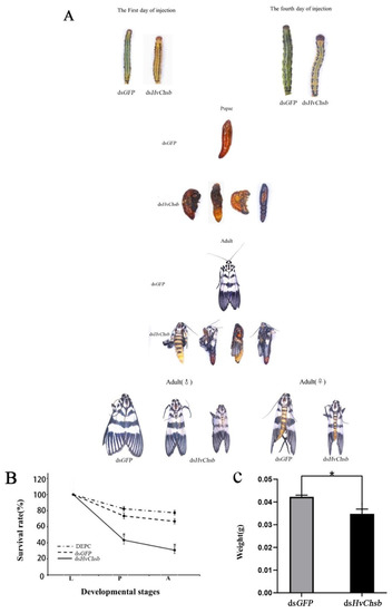 Effects of HvChsb RNAi on larval-to-pupal and pupal-to-adult molting. (A) Data on developmental abnormalities or lethality due to the RNAi treatment of HvChsb are shown as the mean ± standard error of three biological repeats. (B) Effects of HvChsb RNAi on larval-to-pupal and pupal-to-adult transition rates. Rates of insect survival from fifth-instar larval stage to adulthood after dsHvChsb injection (* p < 0.05, Kaplan–Meier survival analysis with log-rank test). Data are the mean ± standard error of three biological repeats. (C) Larval weight at 24 h after dsHvChsb and dsGFP injections. These data were recorded separately based on a sample size of 120 larvae. Error bars represent mean ± standard error of three biological replicates.* p < 0.05, based on Student’s t-test.