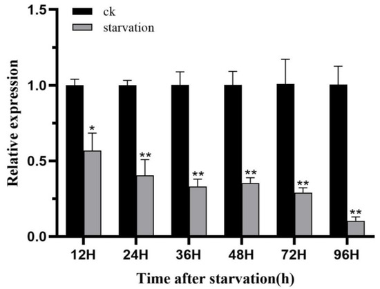 Expression profiles of HvChsb after 96 h of starvation. Expression levels at 12, 24, 36, 48, 72, and 96 h after starvation were normalized compared to those at 12, 24, 36, 48, 72, and 96 h after feeding (control). * p < 0.05; ** p < 0.01 (t-test). Data are the mean ± standard error of three biological repeats.
