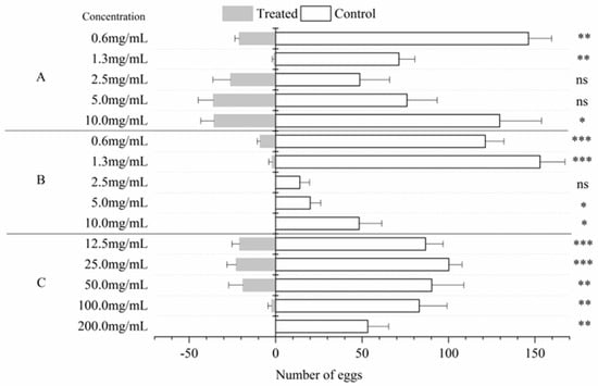 Number of P. xylostella eggs (mean ± SE) on leaves treated with five concentrations of 3,4-dimethoxycinnamic acid (A), caryophyllene oxide (B), A. pubescens extract (C), and with the control. Asterisks indicate significant differences: * = p < 0.05, ** = p < 0.01, *** = p < 0.001, ns = p > 0.05 (independent-samples t-test).