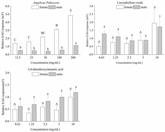 EAG responses were elicited by concentrations of 200, 100, 50, 25, and 12.5 mg/mL A. pubescens extract, concentrations of 10, 5, 2.5, 1.25, and 0.63 mg/mL caryophyllene oxide, and 3,4-dimethoxycinnamic acid treatment (Figure 2). In both sexes, the EAG responses were higher under different concentrations of caryophyllene oxide than these under 3,4-dimethoxycinnamic acid. In the A. pubescens extract treatment group, the EAG responses indicated that the female moths were slightly more affected than the male moths, with EAG values of 4.86 (female) and 1.13 mV (male) at 200 mg/mL, respectively. In the caryophyllene oxide treatment group, the EAG response of female adults was slightly lower than that of male adults at concentrations of 2.5, 1.25, and 0.63 mg/mL. The EAG responses of male adults treated with caryophyllene oxide at 0.63 mg/mL were higher than at the concentrations of 5, 2.5, and 1.25 mg/mL, which indicated that male receptors were more sensitive at lower concentrations. The EAG responses of P. xylostella treated with 3,4-dimethoxycinnamic acid showed that the female moths were less sensitive than the male moths, with EAG values of 1.00 (females) and 1.19 mV (males) at 10 mg/mL, respectively. The EAG responses of female moths treated with 3,4-dimethoxycinnamic acid did not differ significantly at 5, 2.5, 1.25, and 0.63 mg/mL, with values of 0.46, 0.59, 0.35, and 0.49 mV, respectively.