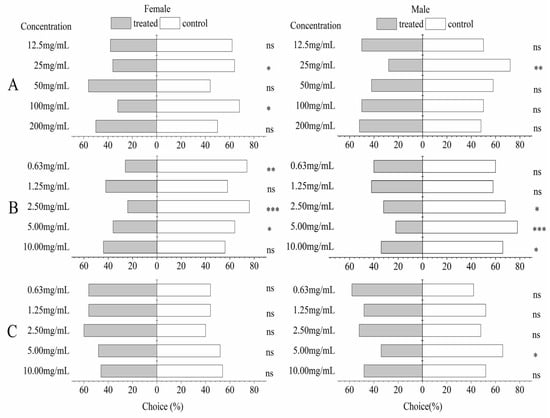 Behavioral responses of female and male P. xylostella adults to A. pubescens extract, caryophyllene oxide, and 3,4-dimethoxycinnamic acid in a Y-tube olfactometer. Both bars represent the percentages (percent choice n = 100) of moths that chose the treated (A. pubescens extract (A), caryophyllene oxide (B), and 3,4-dimethoxycinnamic acid (C) at five concentrations) or control arm. Asterisks indicate significant differences: * = p < 0.05, ** = p < 0.01, *** = p < 0.001, ns = p > 0.05 (Chi-squared (χ2) test).