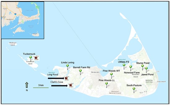 A further consideration for choosing to study these islands is that small coastal islands are attractive sites for testing various types of wildlife interventions to prevent tick-borne diseases, e.g., [43,44], and baseline data are needed to gauge the efficacy of such efforts. Specifically, Buchthal et al. [45] proposed releasing white-footed mice that are genetically engineered to be resistant to B. burgdorferi on Nantucket and Martha’s Vineyard [45,46]. They plan to carry out preliminary field trials with genetically engineered mice on small islands in the region [45].