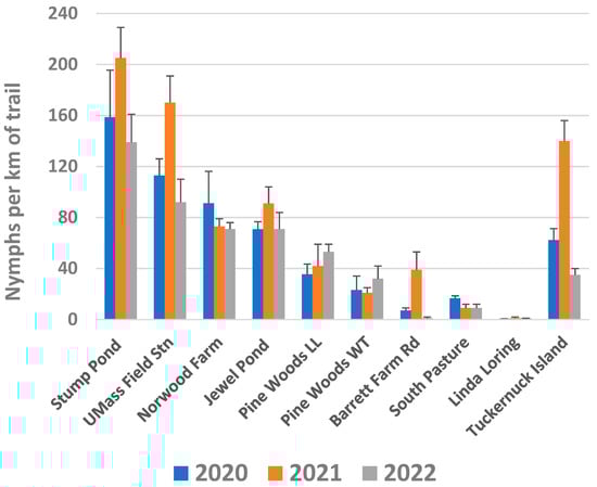 Average nymphal densities were generally highest in 2021 and lower in 2020 and 2022, although not every site showed this pattern (Figure 2). Across the 10 study sites, we observed 37% more Ixodes nymphs/km in 2021 compared to 2020, and 9% fewer in 2022 compared to 2020. The relative nymphal density across the 10 sites was roughly consistent year-to-year, e.g., Stump Pond and UMass Field Station had the two highest densities each year while Linda Loring had the lowest (Figure 2).
