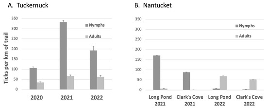 Average densities of Amblyomma americanum on (A) Tuckernuck Island (one site, 2020–2022), and (B) Nantucket (two sites, 2021, 2022). Averages (±1 SE) based on 4 days of sampling per site per year, except for 2021 on Nantucket with 3 days of sampling.