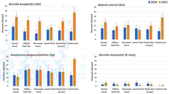 Nymphs that are infected with more than one pathogen pose an elevated health risk for people who acquire more than one disease from them [99]. On Nantucket, 3–7% of nymphs were coinfected with Bb+Bm in 2020 and 2021, respectively, and 37–41% of nymphs that were Bb-positive also tested positive for Bm, posing a greater health risk than either pathogen alone. Coinfection with these two pathogens was even more common on Tuckernuck. Many previous authors also report that coinfections with Bb+Bm occurred more frequently than expected based on the overall prevalence of each pathogen individually [28,92] and references therein, presumably because larvae fed on reservoir hosts that were coinfected with both pathogens. In addition, laboratory experiments suggest that coinfection with Bb+Bm in white-footed mice appears to facilitate the transmission of Bm to larvae of blacklegged ticks [94].