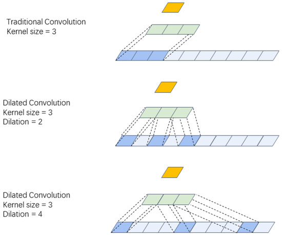 Traditional convolution uses a kernel size of 3, while dilated convolution uses a kernel size of 3 and a dilation of 2 and 4. The green block represents the convolution kernel, while the orange block represents the current output.