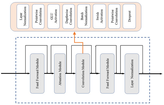 Recurrent neural networks (RNNs) are a powerful model for sequential data [41], and the most prominent example of RNNs is the long short-term memory (LSTM) network. However, the training process of LSTM can become challenging due to the problem of vanishing or exploding gradients during the backpropagation process. Additionally, LSTM requires a large number of parameters to model, leading to high model complexity. Therefore, in this study, we proposed a time-domain Conformer (T-Conformer) structure. Figure 3 illustrates the structure of the T-Conformer, which comprises a convolutional module, an attention module, and two feed-forward modules, with skip connections between different modules. The convolution module contains a pointwise convolution with an expansion factor of 2 that projects the number of channels with a GLU activation layer, followed by a depthwise convolution. The depthwise convolution is followed by a batch normalization and then a swish activation layer. Compared with LSTM, the T-Conformer is capable of processing input sequences in parallel using self-attention, which significantly reduces both training and inference times. Additionally, pointwise convolution and depthwise convolution further enhance its processing efficiency.