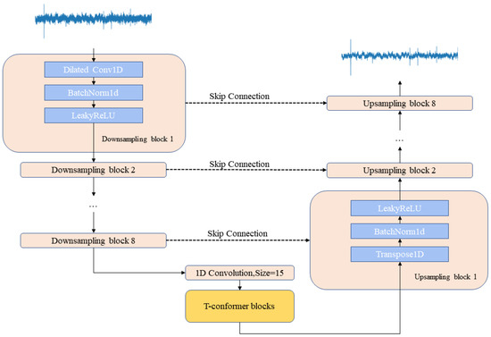 The T-CENV is composed of an encoder, a decoder, and two layers of T-Conformers. The encoder in the T-CENV model comprises eight downsampling layers, each composed of a dilated convolution layer, a batch normalization layer, and a LeakyReLU activation function. These layers are applied sequentially to the time-domain signal (raw waveform) of the boring vibration to obtain the corresponding latent representations. As the convolutional layers in the encoder can only extract local high-level features [42], these latent representations are then fed into the T-Conformer blocks, which capture local and global dependencies to model the sequence information. To correspond to the encoder, the decoder also has eight upsampling layers. Each upsampling layer includes a 1D transposed convolution layer followed by a batch normalization layer and a LeakyReLU activation function layer. The decoder reconstructs the time-domain boring vibration signal from a latent representation estimated through the T-Conformers. A skip connection connects the output of each encoder layer to the input of the corresponding decoder layer. Figure 4 illustrates the overall structure of the T-CENV. All convolutions have a kernel size of 15, a stride of 2, and a padding of 7. All transposed convolutions have a kernel size of 5, a stride of 2, and a padding of 2. All leakyReLU activation function layers have a 0.1 negative slope. The output channels of the encoder layers are 16, 32, 64, 64, 128, 128, 256, and 256, respectively. To maintain the shape of the output the same as the input, the number of input channels of the transposed convolution is twice the number of output channels of the corresponding encoding layer, and the number of output channels is the same as that of the previous encoding layer.