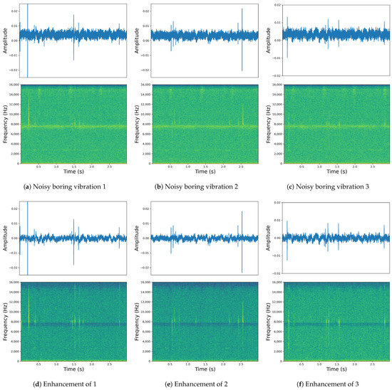 In Equation (1), represents the noisy boring vibration signals, represents the clean boring vibration signals, and represents the environmental noises. The task of this study is to estimate the clean boring vibration signals from such that the difference between and is minimized, which can be expressed as