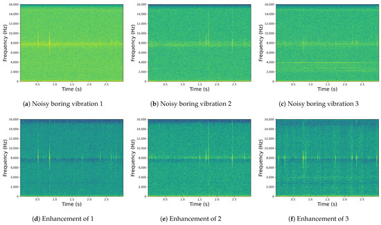 In this study, we assessed our model’s performance using three widely adopted objective metrics: the signal-to-noise ratio (SNR), the segmental signal-to-noise ratio (SegSNR), and the log-likelihood ratio (LLR). We refrained from utilizing popular speech enhancement evaluation metrics, such as Perceptual Evaluation of Speech Quality (PESQ) [43], Short-Time Objective Intelligibility (STOI) [44], etc., owing to their speech-specific design. Deploying them to boring vibration signals would be inappropriate. Hence, we employed the same evaluation metrics as in prior boring vibration signals research. SNR represents the ratio of energy in clean boring vibration sound to that of noise. SegSNR is an average SNR value computed per frame, and LLR represents the ratio of the energies of the prediction residuals of the enhanced and clean signals. The equations for them are provided as follows: