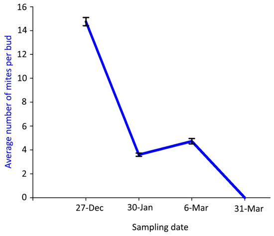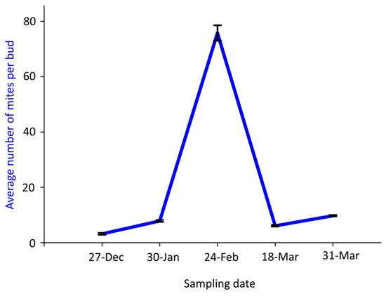 The mean number of live mites per bud was significantly highest (75.8 mites) on 24 February 2018, whereas fewer than 10 mites per bud were found on the other sampling dates (Figure 3).
