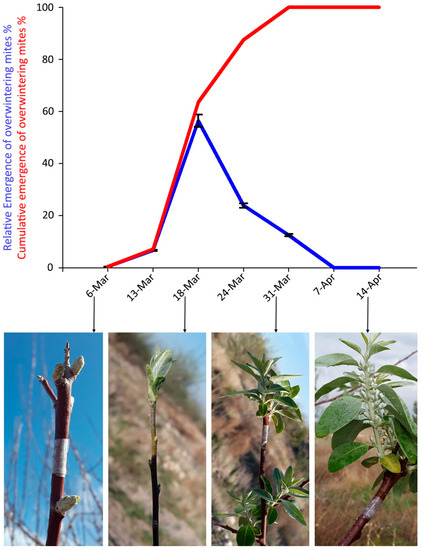 Mites were trapped between 13 and 31 March 2018. The peak of emergence of overwintering mites was recorded on 18 March, when bud break started (Figure 5). The cumulative emergence curve of overwintering mites (Figure 5) reached values over 50% around 17 March.