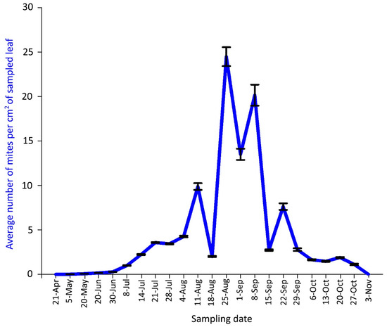 Population dynamics of Aceria angustifoliae: mean number of active mites on Russian olive leaves in April–October 2018. Bars indicate the standard error range.