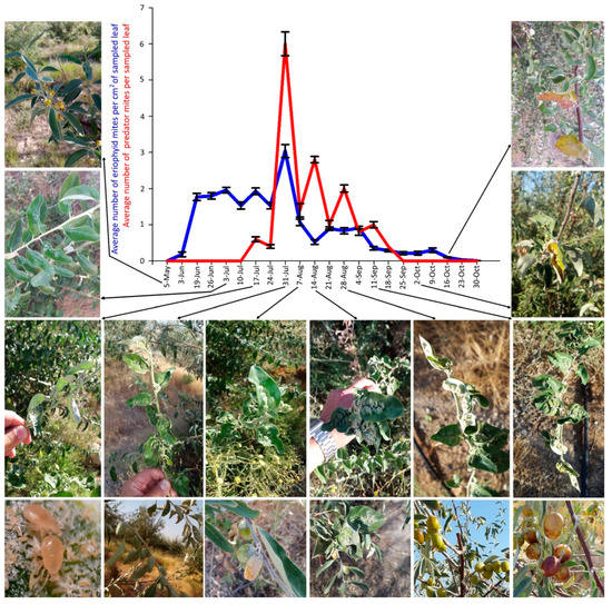 Population dynamics of Aceria angustifoliae and Phytoseiidae: mean number of active mites on Russian olive leaves and their correlation with phenological stages and symptoms on infested trees, in May–October 2019. Bars indicate the standard error range.
