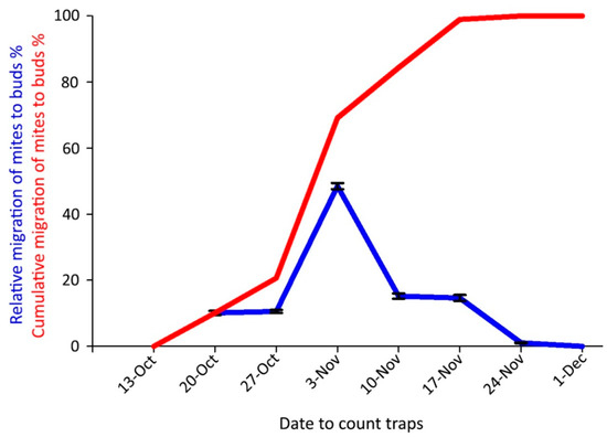 The onset of the mite overwintering period in the buds in 2018 coincided with the beginning of autumn leaf color changes, on 20 October. The highest captures occurred on 3 November when the cumulative emergence curve was over 50% (Figure 9); the last captures were obtained on 24 November.