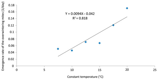 No mites were recorded on any of the twigs exposed for 40 days at 5 °C in the laboratory; data recording was stopped after that period at that temperature. The emergence rates at temperatures between 7.5 and 20 °C were plotted in order to determine the LDT and to construct a DD regression model (Figure 10).