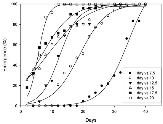 At all tested temperatures, the time (days) needed for 50% emergence (T50 parameter) of A. angustifoliae was predicted by the three-parameter sigmoidal model (Figure 11, Table 1). The results indicated that the T50 parameter decreased from 7.5 to 20 °C. Obviously, mite emergence from the overwintering sites occurred more rapidly at higher temperatures (Table 1) and, on average, it ranged between 85.5 DD at 20 °C and 104.4 DD at 10 °C.