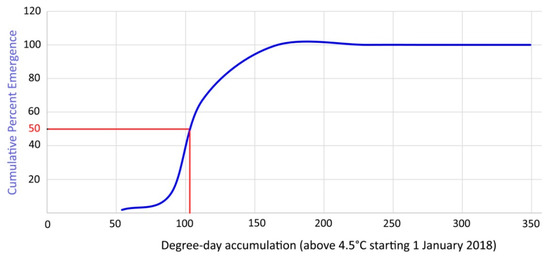 Cumulative percent emergence curve of overwintering mites based on DD above 4.5 °C starting on 1 January 2018.