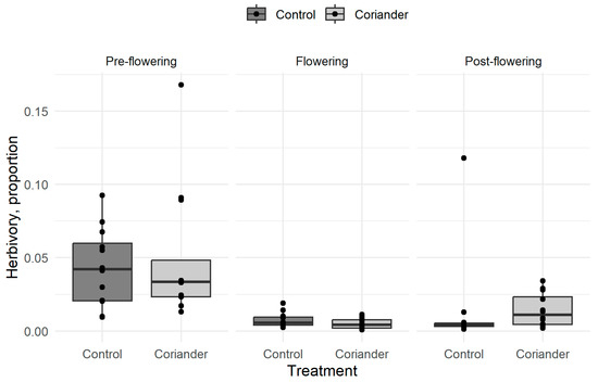 The average leaf surface loss on a lettuce plant after 2 weeks was 2.2% (SD = 3.0%, n = 72). Herbivory was not significantly different between the coriander and the control plots but significantly higher before than during or after coriander flowering, and after flowering than during flowering (Figure 1; Table 1, Tables S2 and S3). We did not try to identify herbivores responsible for the damage, but we occasionally observed slugs, snails, and caterpillars on the sentinel plants.