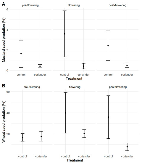 More than half of the boxes (51.0%) suffered no seed predation, while 17 of them (5.9%) had 100% predation (16 at Quinta do Rosario, all with wheat grains). We registered intermediate levels of seed predation (43.1%) in the rest of the boxes. The probability that at least one seed in a box was predated was significantly higher with wheat than with mustard seeds and in the control than in the coriander plots, irrespective of the seed predators or the coriander phenology (Tables S4 and S5). Most of the predated seeds (61.1%) disappeared, while the rest were damaged. Wheat seed predation was not significantly different in the treatment and control plots before coriander flowering, but it was significantly higher in the control plots than in the coriander plots both during and after flowering (Figure 2, Table 1, Tables S6 and S7). Mustard seed predation was significantly higher in the control than in the coriander plots and during coriander flowering than before and after it (Figure 2, Table 1, Tables S8 and S9).